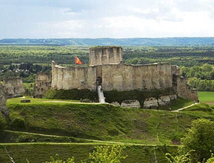 "In 1189, the great-great-grandson of William the Conqueror, Richard the Lionheart, son of Henry II of England and Eleanor of Aquitaine, ruled a kingdom stretching from the Pyrenees to the Scottish borders and encompassing England, Normandy, Aquitaine, Poitiers, Maine and Anjou. In just two years (1196-1198) Richard had a castle built overlooking the right bank of the Seine valley at Les Andelys, the great Château Gaillard. Considering the defensive military architecture of its day, Château Gaillard symbolised great power over Normandy.(photo ctsy. of Bargain Travel Europe)